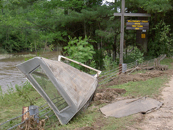 I tiny tributary of the Willowemoc just upstream from the Catskill Fly Fishing Center and Museum had a horrific flood and washed over the road. Here's some of the debris left behind.