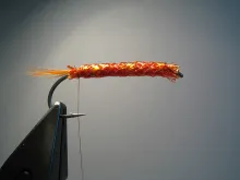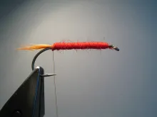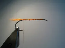 False hackle (throat) Orange hackle fibres, let them almost reach the hook point.