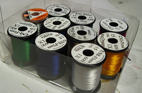 Spool plastic binsThreads are usually sold by the dozen, and the plastic bins a dozen spools come in are very handy for spool overflow - things that don't fit in your organizer anymore. Just set them off to the side, you'll use it eventually. Fly tyers throw away nothing. |