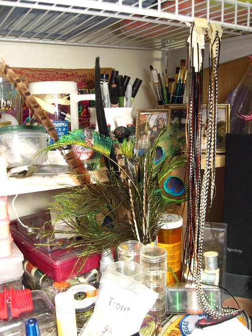 Feathers readily availableI like to keep some feathers handy and readily available. Here you see some peacock pieces and a couple pheasant tails. I used to haunt a local craft store and pick over their peacock feathers when their flower arranging department had a sale. I'd get full sticks for fifty cents apiece, so I stocked up. I keep a couple on my desk and the rest out of the way. On the right is a waterfall of dry fly saddle hackle. I reach there first before diving into my bin of hackle, as chances are I'll find the hackle I need. When I'm done, I tape the hackle on the waterfall with a piece of masking tape so I can use the rest next time. Problem is my daughter has an eye on those feathers for her hair. Hands off, Sarah!! |